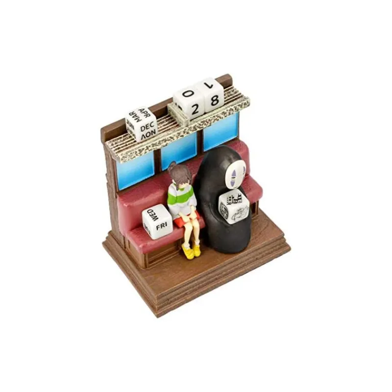 Calendrier représentant Chihiro et No Face de Spirited Away. Au lieu de pages, il se compose d’un diorama et de plusieurs dés, pour la date, le mois et le jour de la semaine.